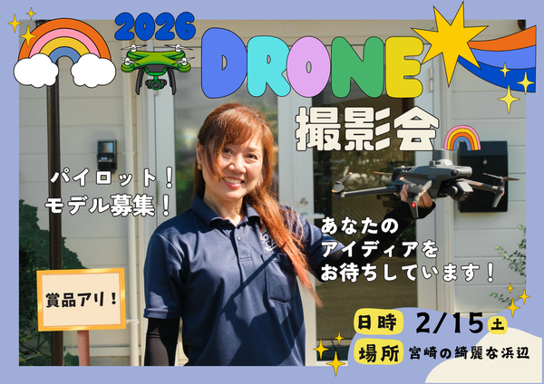 ドローンで撮影会!あなたのアイディア待ってます♪ 2026.01.08 宮崎のとっても綺麗な海辺で開催!宮崎ドローン撮影会♪募集対象は…✔️ ドローンパイロット✔️ 空撮モデル(初心者歓迎!)✔️ アイデア提案者◇参加特典◇▪ 撮影データは全て参加者が100%自由に利用OK!▪ スキルコンテスト開催!最大20,000円の賞品!▪ モデル参加者にはQUOカード3,000円を必ずプレゼント!▪ 宮崎ドローン仲間と交流できるチャンス!▪ 撮影後は自由参加の交流会(食事会)も予定!⏳ 募集人数:先着10名限定!お申込みはこちらから⤵ お問い合わせはソラカラへ 会社名Soracara [ソラカラ] ― 株式会社 安藤商事 ― 所在地〒880-0841 宮崎県宮崎市吉村町西田甲645番地3 連絡先TEL:0985-62-1504 / FAX:0985-35-3165 営業時間8:30~17:30 定休日土日・祭日 設立2014年4月1日 事業内容 ドローン講習 ドローン機体販売・リース・保守 ドローンによる空撮・測量・3Dデータ作成・スマート農業